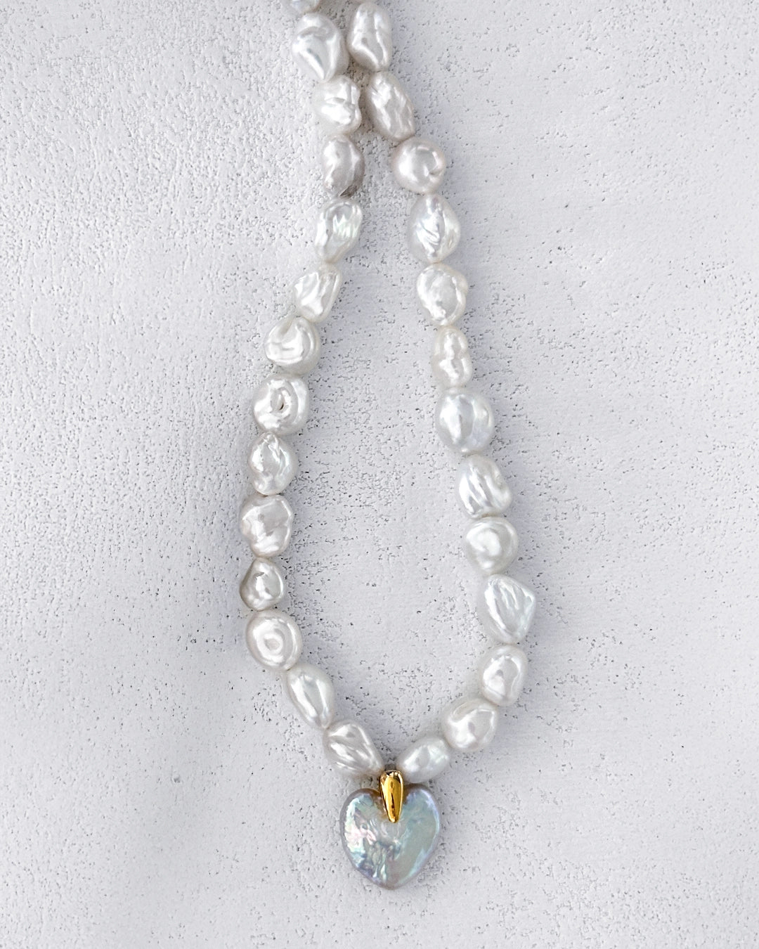 The Heart of the Moon necklace radiates celestial beauty. Lustrous baroque pearls dance around your neckline, culminating in an iridescent heart pendant that captures your feminine strength.