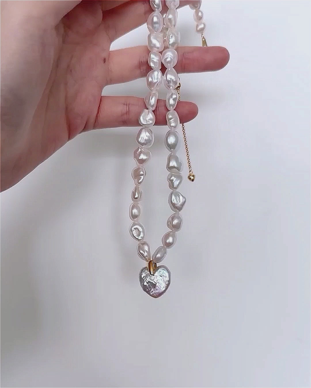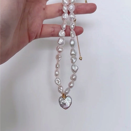 This strand features lumpy, mismatched pearls that trade the "perfect" look for a raw, natural vibe. A large heart pearl is held at the centre by a bold gold clip, mixing a sweet symbol with a clean, modern finish. It is a versatile piece that hits the balance between soft and empowerment.