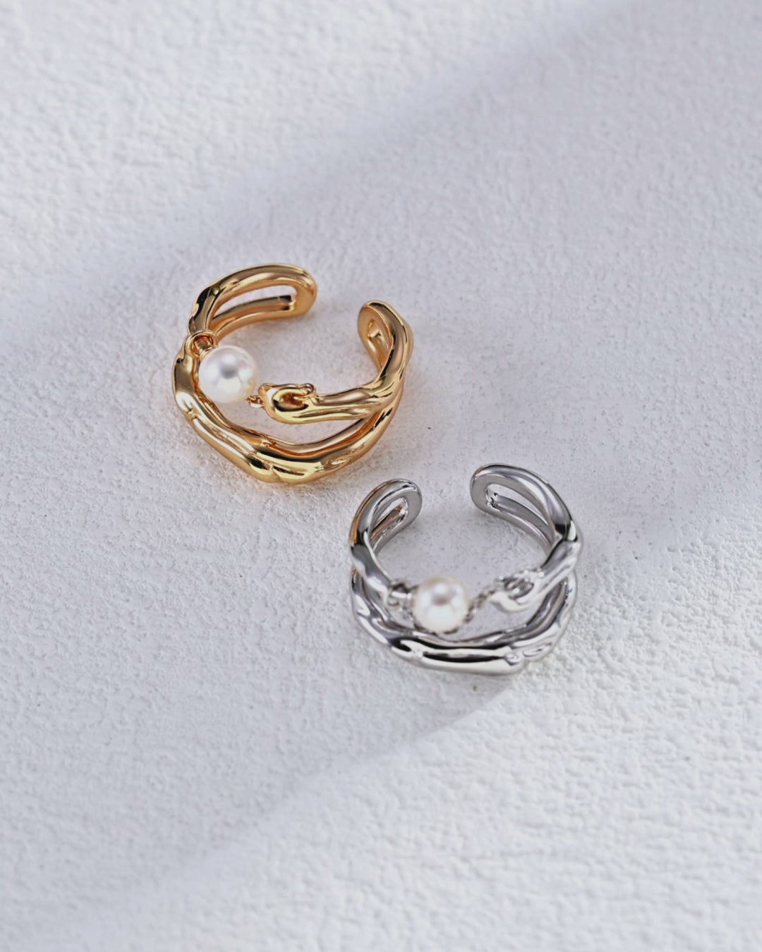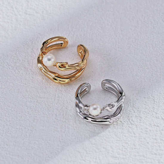 A single luminous pearl floats within the architecture of overlapping, high-shine bands, anchored by a delicate, moving chain. This design captures a sense of constant, graceful motion that plays against the sculpted foundation. An artful statement piece that feels modern, balanced, and effortlessly cool.