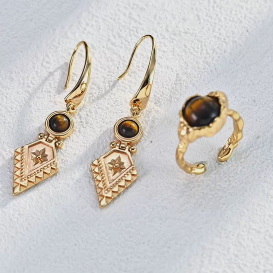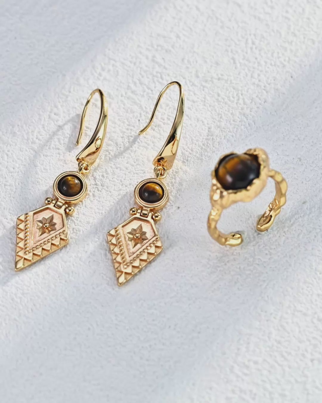 A luminous tiger’s eye stone sits at the centre of a hand-sculpted, textured band. The stone’s natural stripes catch the light, creating a deep, shifting movement against the rich gold surface. It’s a grounded, statement-making piece that feels confident and effortless.